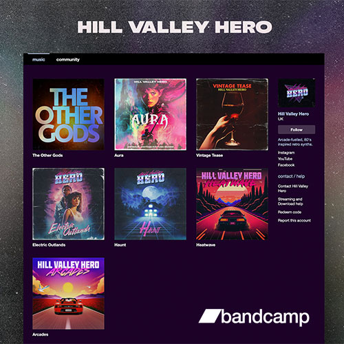 For Hill Valley Hero, I developed a series of album covers that translate his self-described “arcade-fuelled, 80s-inspired retro synths” into bold, cinematic visual identities. The design direction pulls from classic 80s movie posters, arcade cabinets, vintage game packaging and neon-soaked sci-fi aesthetics.