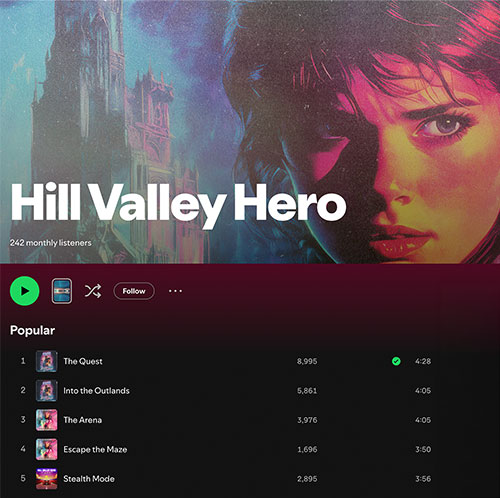 For Hill Valley Hero, I developed a series of album covers that translate his self-described “arcade-fuelled, 80s-inspired retro synths” into bold, cinematic visual identities. The design direction pulls from classic 80s movie posters, arcade cabinets, vintage game packaging and neon-soaked sci-fi aesthetics.